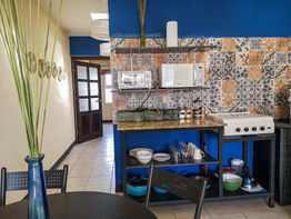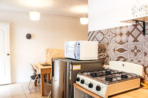 Ubicado en segundo nivel. Patio comunitario. Máximo 2 personas. Persona adicional con costo extra. Todo equipado y los servicios de luz, internet, agua, extracción de basura y limpieza una vez por semana incluidos, menos el gas para estufa. Lavandería no incluida.
